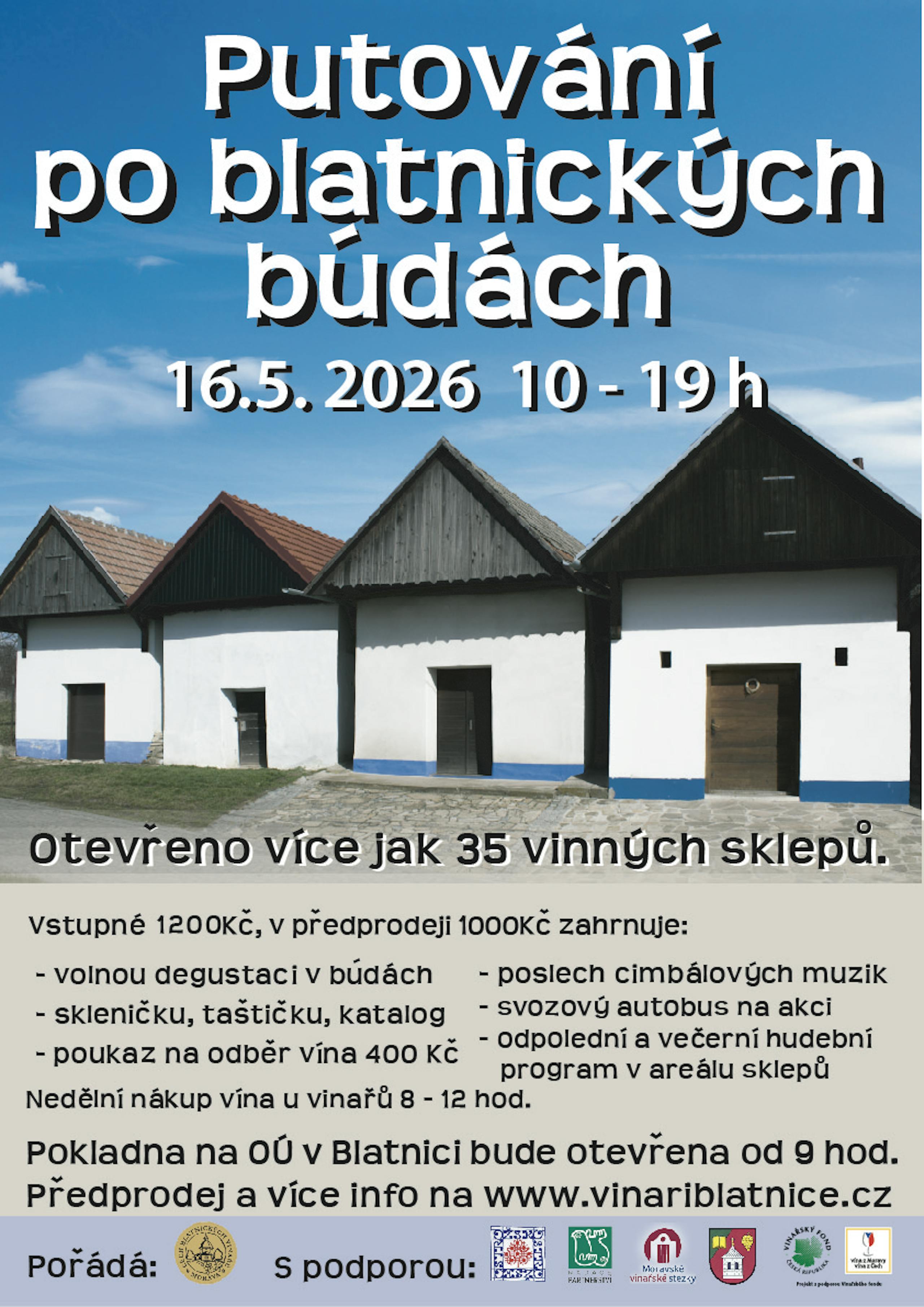 Každoroční hojně navštěvovaná akce, která probíhá v celé obci Blatnice pod Svatým Antonínkem a areálu historických búd Stará hora. Od 10.00 do 19.00 hod. bude otevřeno asi 40 sklepů. Vstupné 1200 Kč (internetový předprodej 1000 Kč) zahrnuje volnou degustaci ve všech búdách, degustační set (sklenička, taštička, propiska), katalog vinařů s mapou, poukazy na odběr vína v hodnotě 400 Kč, jízdu koňským spřežením, cimbálové muziky, ukázky lidových řemesel, vstup do blatnického muzea, večerní zábavu a další bohatý doprovodný program včetně místních specialit. Svoz na akci z okolních obcí zajištěn. Možnost stanování na fotbalovém hřišti mimo hrací plochu.