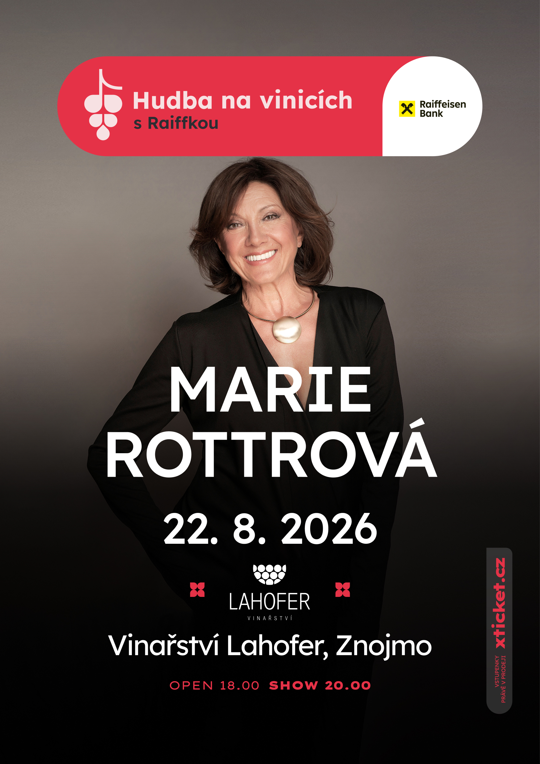 Hudba na vinicích s Raiffkou se vrací do Dobšic u Znojma, kde spolupráce s vinařstvím Lahofer funguje už od samého začátku projektu. V roce 2025 se podařilo vyprodat téměř všechny koncerty a i pro rok 2026 je připravena skvělá sestava českých i slovenských hvězd. Tentokrát premiérově v rámci Hudby na vinicích zahraje Marie Rottrová.
