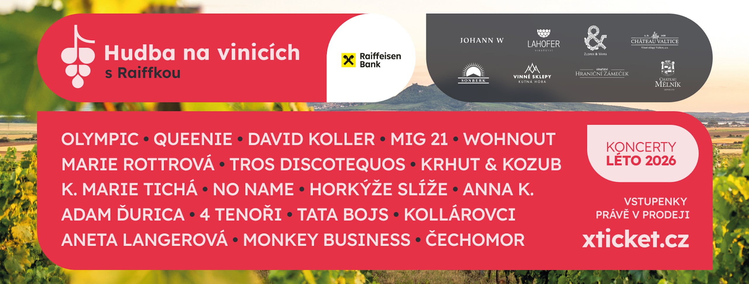 Oblíbená série open air koncertů „Hudba na vinicích“ má za sebou veleúspěšný ročník, ale organizátoři už se hlásí s novinkami pro rok 2026. Sedmý ročník akce nabídne rekordních 69 koncertů, dosud nejvíce v historii. Ruku v ruce s tím jde rozšířené spektrum vystupujících umělců a také dvě zbrusu nové lokace, samozřejmě spojené s vínem. Na pódiu se objeví každoroční stálice jako David Koller, Queenie, Čechomor, duo Krhut & Kozub, Wohnout, Tros Discotequos, No Name, Marii Rottrovou a mnoho dalších. Premiéru si na vinicích navíc odehraje Olympic, Kateřina Marie Tichá, Kollárovci nebo Tata Bojs.