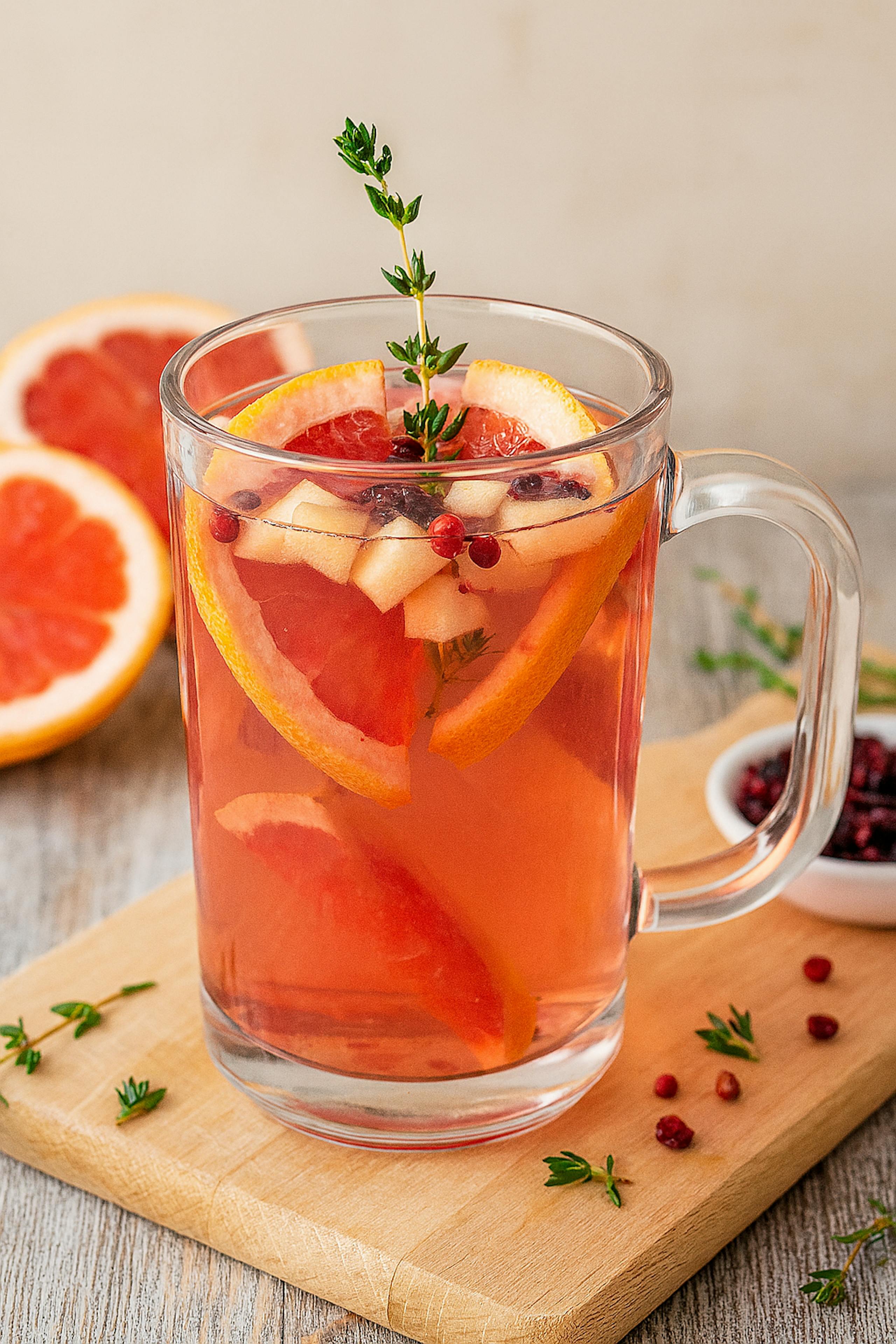 Víno zahřejte společně s grepem, jablkem a tymiánem. Sušené brusinky přidejte těsně před podáváním. Na závěr dochuťte špetkou červeného pepře. „Tento svařák je svěží a elegantní – ideální pro zimní večery,“ doporučuje Klára.![]()
